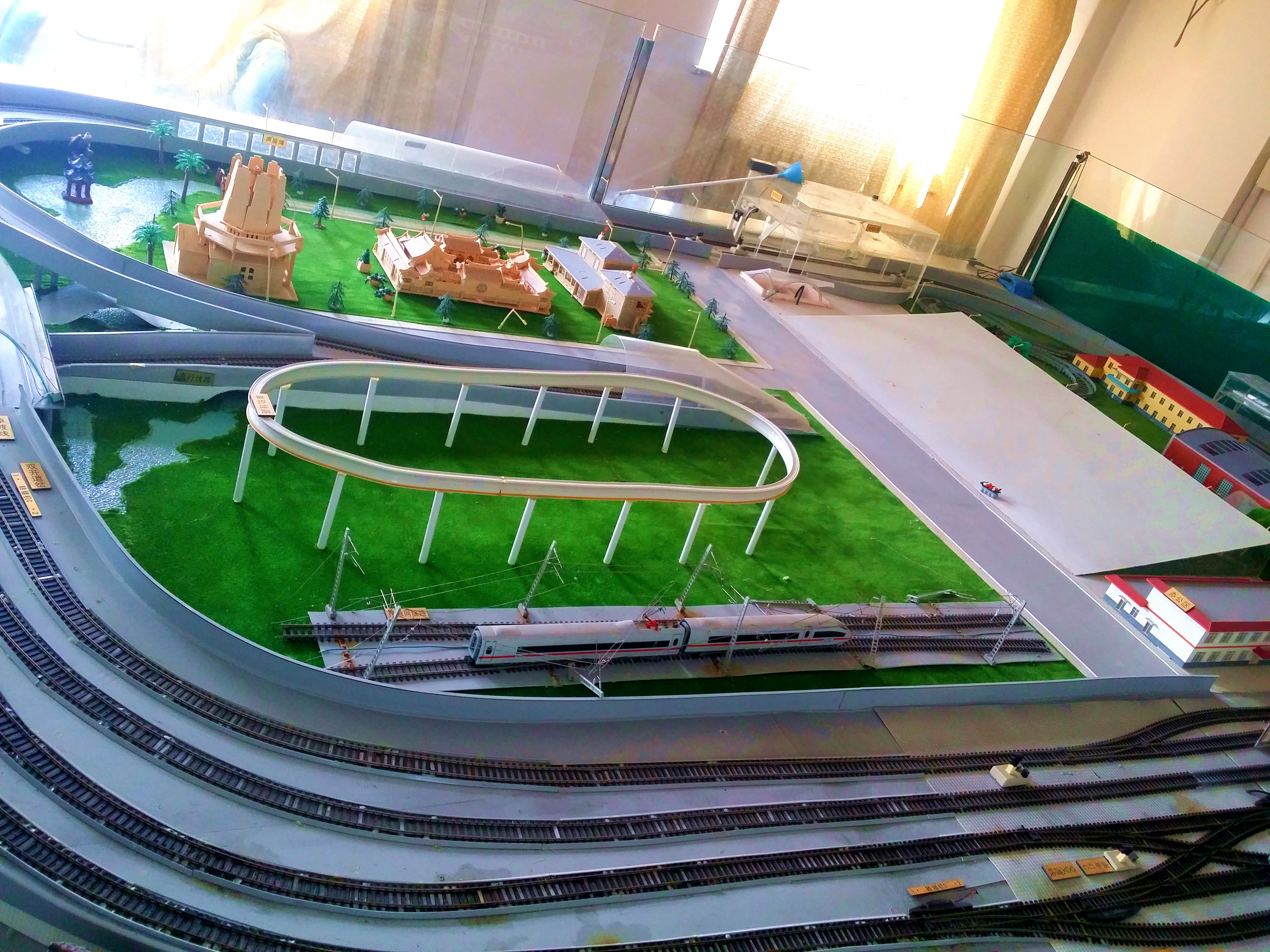 线路教学沙盘以轨道线路为主要内容,将地铁运营典型设施设备、地铁与城市关系等以模型的方式进行展示。能够以人工或电脑控制方式实现列车、信号灯、转辙机运营关联,可实现地铁列车典型行车方式转辙,如折返、进出车辆等。通过观察盘面内容可了解如下地铁运营系统设施设备:城市轨道类型(地铁、城郊轻轨、单轨、磁悬浮、高架接触网线路、有轨电车等);地铁线路类型(类型有主线的环线、直线,辅助线的联络线、渡线、车辆段内外线路;地上高架线、地面平行线、地下隧道线);典型设施设备(车站、车辆段、办公楼、员工生活区、桥隧、路权隔离物、典型道床等);车站类型(地下岛式、地面岛侧混合式、高架侧式、换乘站等);道岔类型(单分、交分、单渡线、交叉渡线、折返线、车辆段线等);红绿灯类型(进出站灯、调车灯等);社会设施(居住区、商业区、市政交通等)。